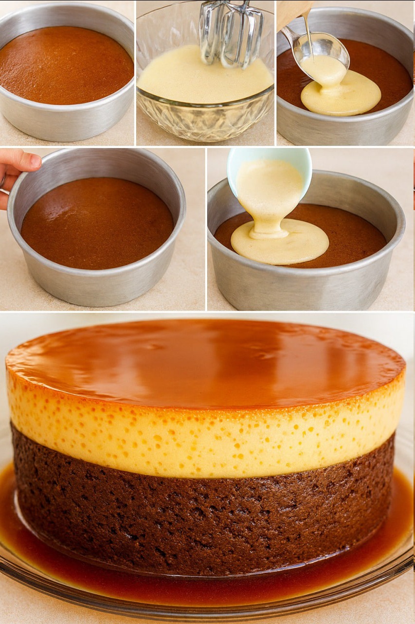 Vierte el caramelo inmediatamente en un molde para pastel de tubo o redondo (preferiblemente de 20-22 cm de diámetro). Inclina el molde para cubrir el fondo uniformemente. Deja enfriar.