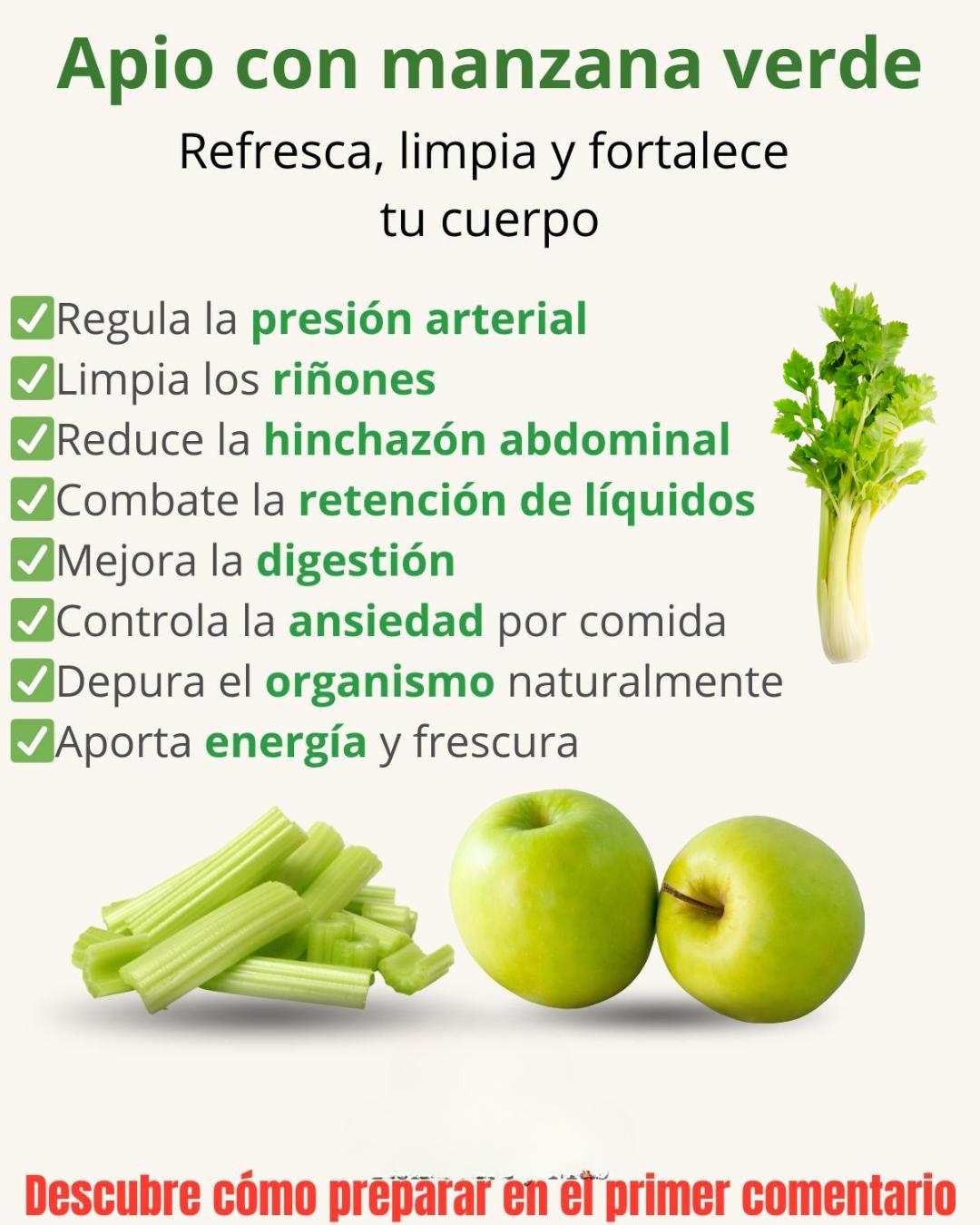 Tanto el apio como la manzana verde son ingredientes ricos en fibra, antioxidantes, minerales y compuestos antiinflamatorios. Al combinarlos, se obtiene una bebida ideal para consumir en ayunas o entre comidas, ayudando al cuerpo a eliminar toxinas acumuladas y equilibrar funciones importantes como la presión arterial, la digestión o la retención de líquidos.